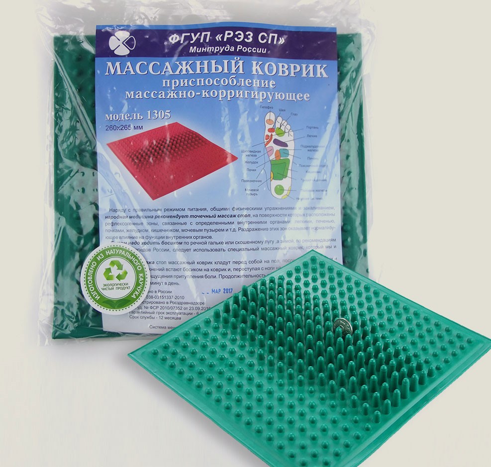 Назначение: для проведения точечного массажа стоп, на поверхности которых расположены рефлексогенные зоны, связанные с оп ределенными внутренними органами: легкими, печенью, почками, желудком, кишечником, мочевым пузырем и т.д. Массаж этих зон ока зы ва ет нор ма ли зу ю щее вли я ние на функ ции внут рен них ор га нов. Ежедневное использо вание ковриков предотвращает множество серьезных заболеваний. Ма те ри ал: ков рики яв ляют ся эко ло ги чес ки чис тыми из де ли ями. Из го тов лены из спе ци аль ной си лико но вой ре зи ны и ре зи ны на ос но ве на ту раль но го ка у чу ка, име ют про филь из де лия, иде аль но со от ве т ству ю щий сво дам здо ро вых стоп. Выпускаются разных форм и цветовых оттенков, позволяющие удовлетворить самого тре бовательного покупателя.